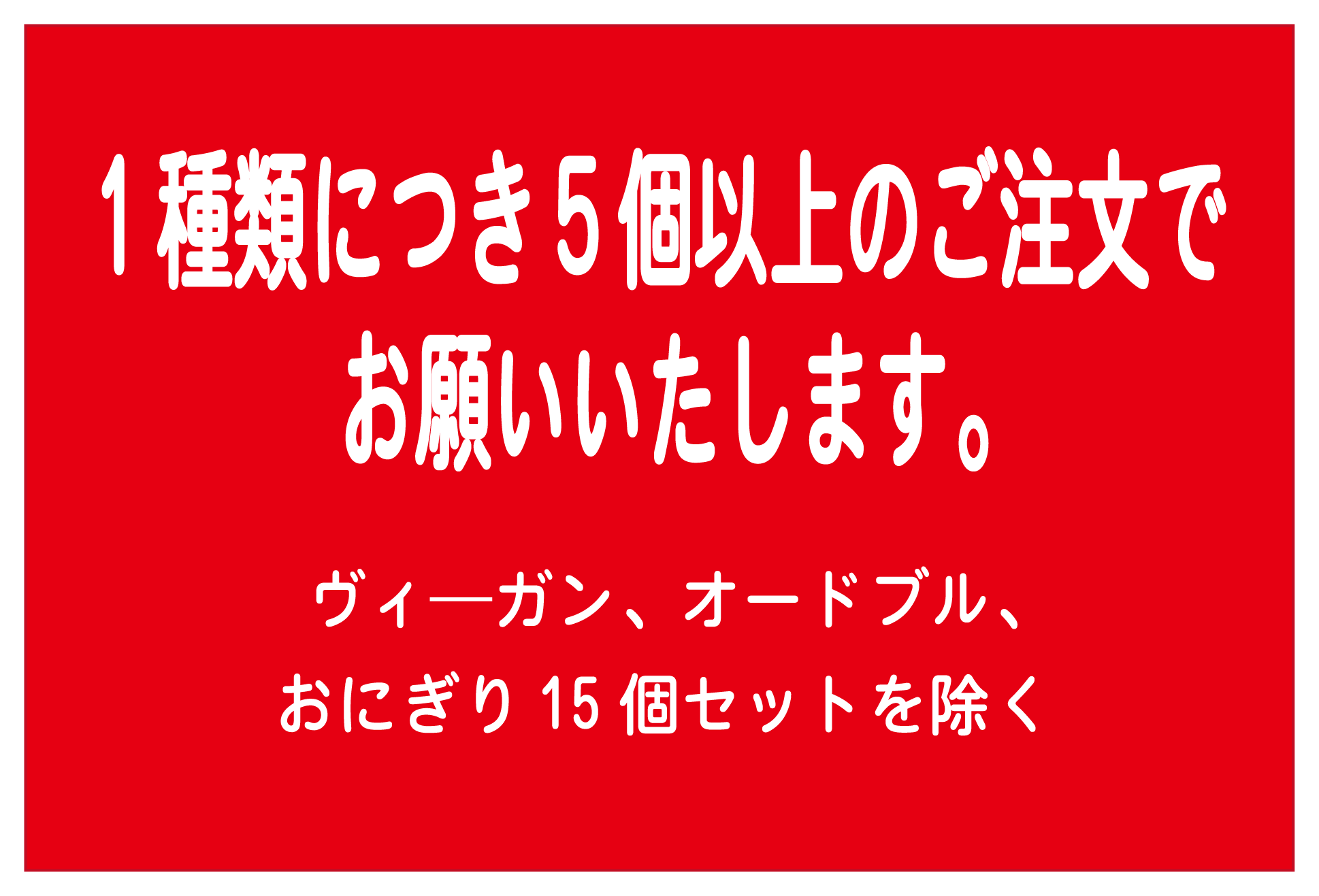 1種類につき5個以上のご注文でお願いいたします。ヴィ―ガン、オードブル、おにぎり15個セットを除く。
